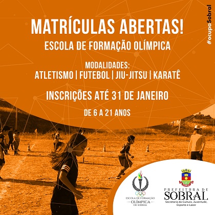 A Prefeitura de Sobral, por meio da Secretaria da Cultura, Juventude, Esporte e Lazer (Secjel) e Secretaria Municipal da Educação (SME), abre inscrições para as escolinhas esportivas da Escola de Formação Olímpica (ESFO/Vila Olímpica). O projeto oferece, gratuitamente, formações nas modalidades de atletismo, futebol, jiu-jitsu e karatê, em especial, para crianças e adolescentes de 6 a 21 anos de idade.