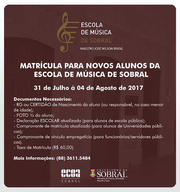 A Escola de Música de Sobral inicia, a partir desta segunda-feira (31/07), o processo de matrículas para novos alunos. Serão oferecidas 240 vagas em 13 cursos de prática instrumental, canto e musicalização, com aulas nos três turnos. As matrículas vão até sexta-feira (04/08) e as aulas terão início no dia 7 de agosto.
