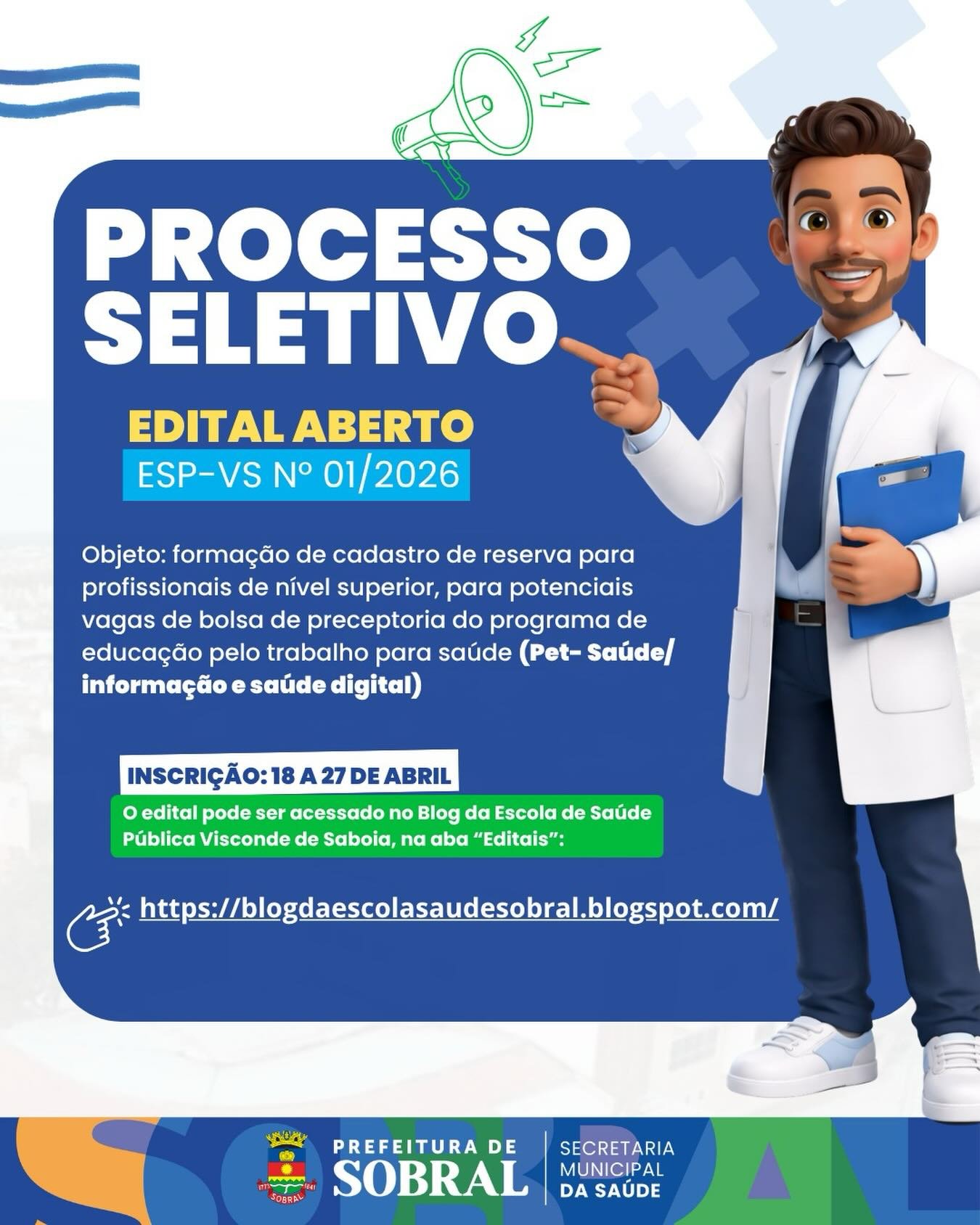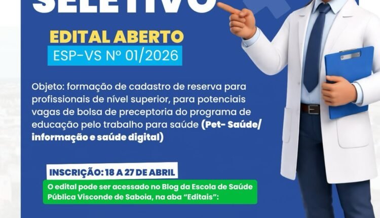 A Secretaria da Saúde de Sobral divulgou o Edital ESP-VS nº 01/2026, que trata do Processo Seletivo Simplificado para a formação de cadastro de reserva de profissionais de nível superior. O objetivo é preencher possíveis vagas de bolsas de preceptoria do Programa PET-Saúde / Informação e Saúde Digital. O edital já está disponível para consulta e pode ser acessado no Blog da Escola de Saúde Pública Visconde de Saboia, na seção de 'Editais'.