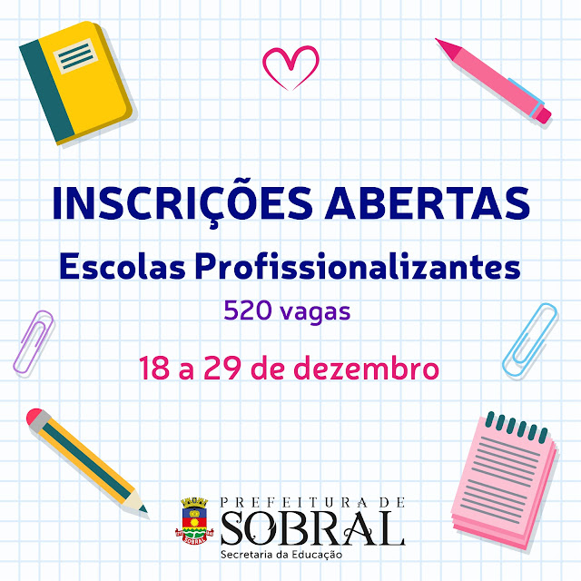As escolas estaduais de educação profissional de Sobral realizarão processo seletivo para ingresso de novos alunos nas turmas de 1º ano do ensino médio. São oferecidas 520 vagas em nove cursos técnicos integrados ao ensino médio. As inscrições acontecem de 18 a 29 de dezembro, das 7h às 11h30 e das 13h às 16h40, na secretaria da escola que o estudante pretende ingressar.