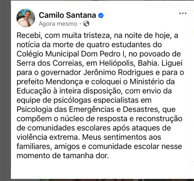 O ministro da Educação, Camilo Santana (PT), também disse nas redes sociais que “recebeu com muita tristeza” a notícia e afirmou que colocou o aparato do Governo à disposição do estado.