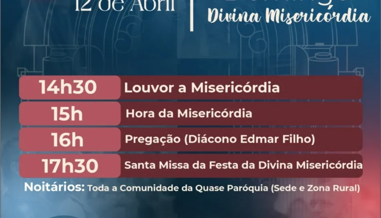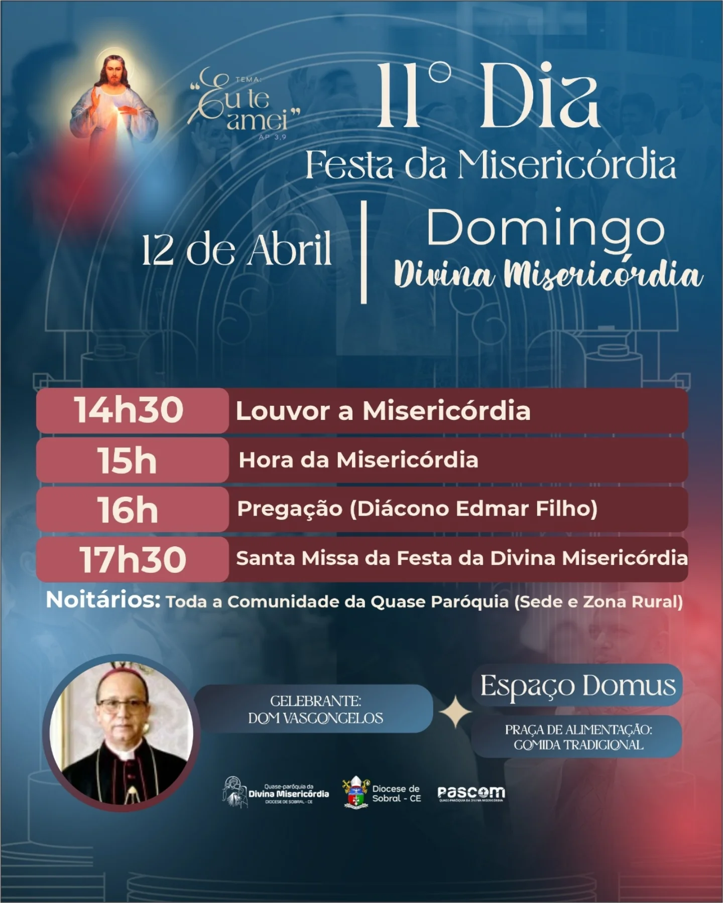 A Festa da Divina Misericórdia, que teve início em 2 de abril, chega ao seu momento de encerramento neste domingo, em Sobral. A programação é realizada pela Quase Paróquia da Divina Misericórdia, no bairro Belchior, sob a condução do padre Ítalo Arcanjo.