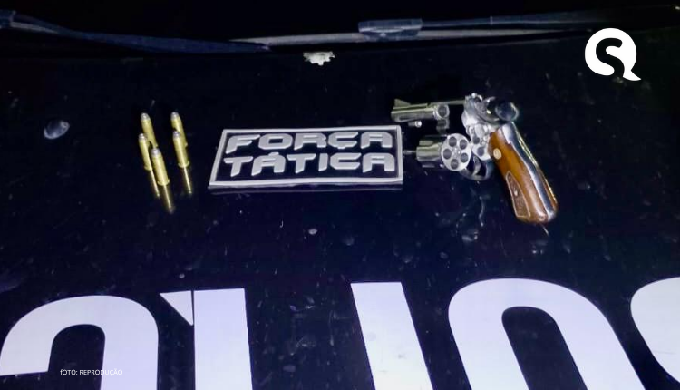 Durante a abordagem e busca no interior do veículo, foi encontrado um revólver de calibre .38, com cinco munições intactas.