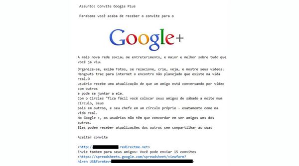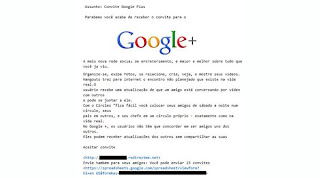 Google está alertando aos internautas para que se precavenham: há convites falsos circulando utilizando o GooglePlus. Como a novidade exige convite de entrada, há e-mails sendo encaminhados aos assinantes que recorrem a vírus Trojans bancários com o propósito de roubar dados das vítimas.