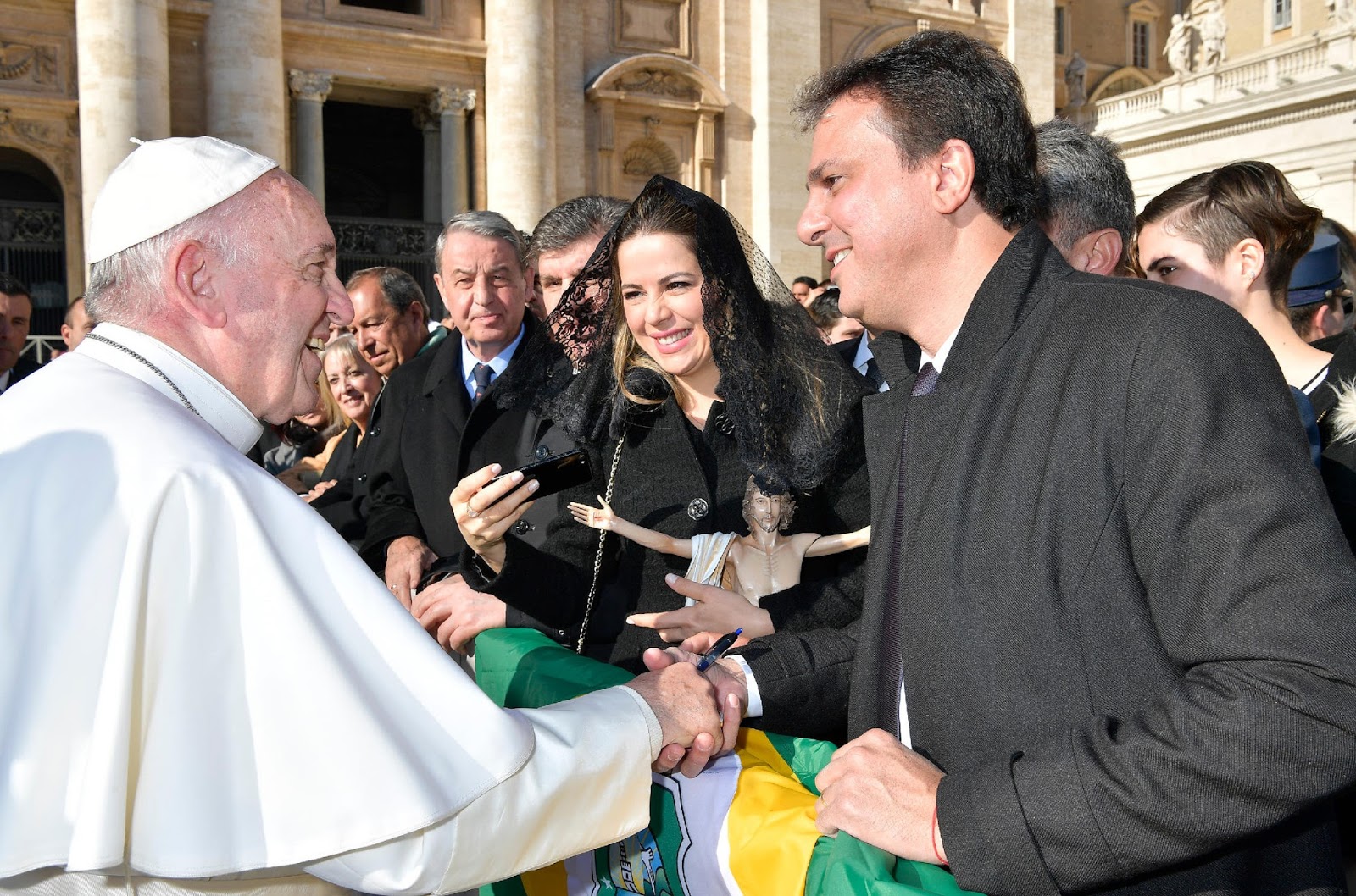Camilo Santana aproveitou o momento para mostrar a bandeira do Ceará ao papa, que abençoou e autografou o símbolo do Estado. “Pedimos muita luz para que o nosso Ceará pudesse enfrentar o momento de dificuldade diante de seis anos de seca, e para que a gente tenha cada vez mais forças para trabalhar e dar mais oportunidade aos pobres. Fiz questão de dizer ao papa Francisco que ele é uma inspiração, exemplo de humildade e de como cuidar dos mais necessitados”, citou o governador.