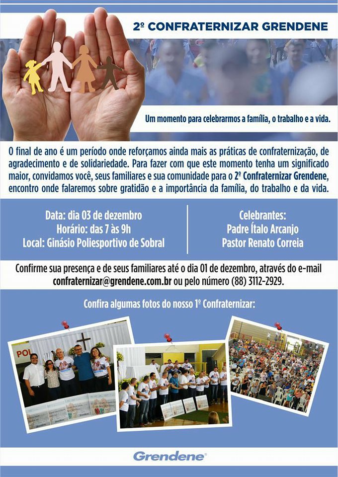 A Grendene promove no próximo domingo, 3 de dezembro, a segunda edição do Confraternizar, evento ecumênico que celebrará as conquistas pessoais e coletivas deste ano de 2017 de todos aqueles que fazem a empresa, e que esse ano foi estendido também a comunidade sobralense como um todo, num momento de ação de graças pelo ano que estamos encerrando.