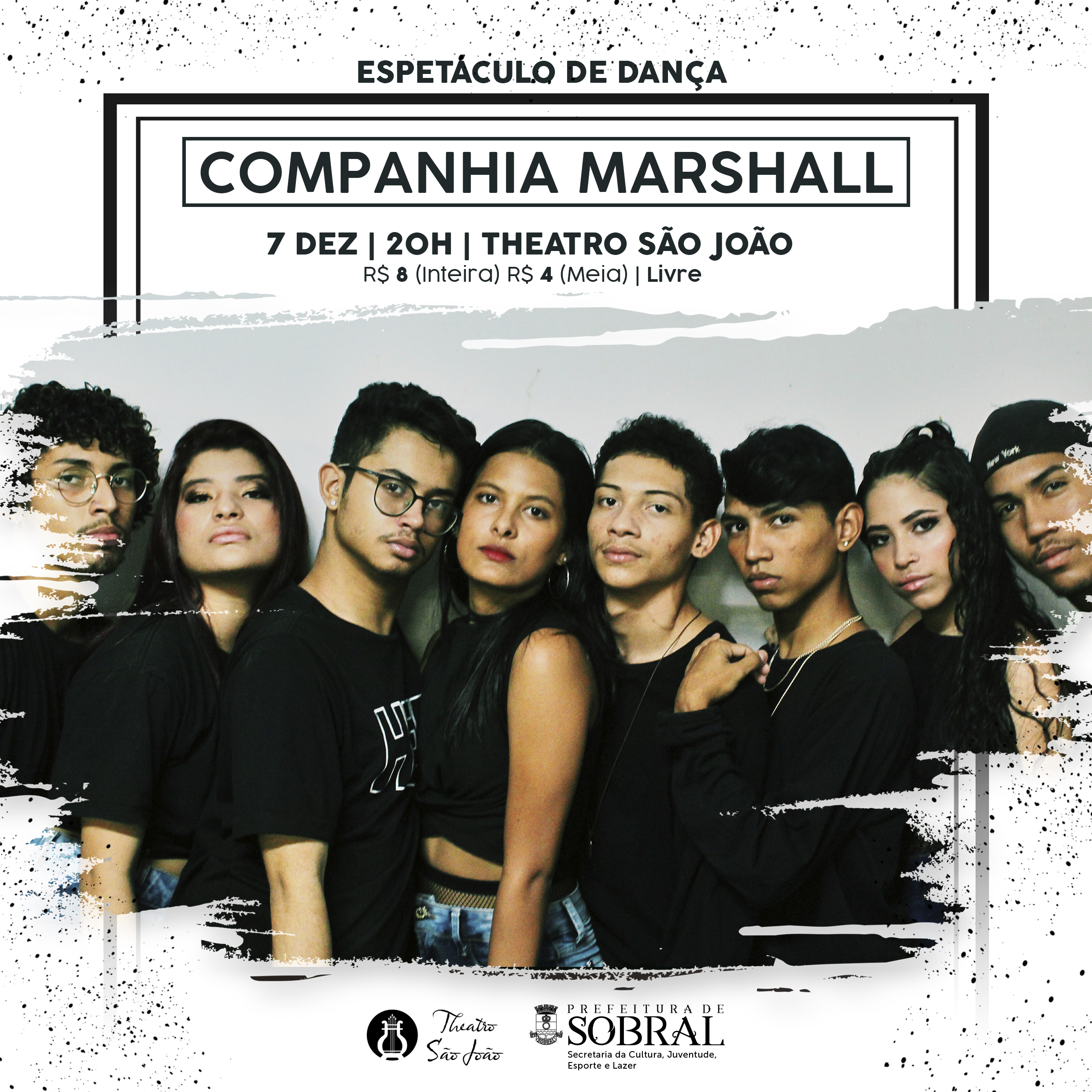 Neste sábado (07/12), o Theatro São João recebe, a partir das 20 horas, um espetáculo de dança da Companhia Marshall. O grupo de dança pop e hip hop aborda uma trajetória de grandes desafios e lembranças para a construção da companhia, retratando os trabalhos locais exercidos dentro das periferias.