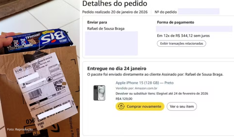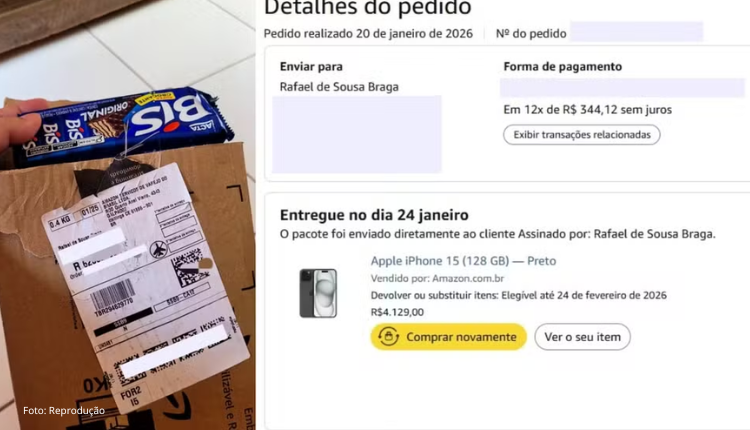 Acostumado a fazer compras pela internet, o enfermeiro Rafael Braga, de 35 anos, teve uma surpresa desagradável no último sábado (24). No pacote que recebeu das mãos do entregador, ele esperava encontrar o iPhone que havia comprado no valor de R$ 4,1 mil. Dentro da encomenda, veio uma caixa de chocolates Bis.