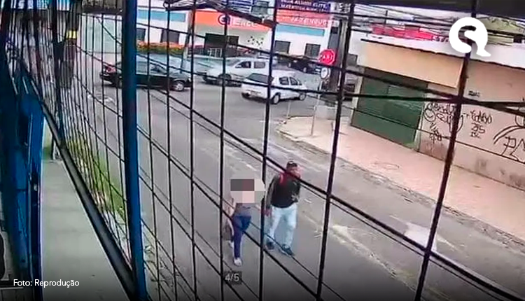 Uma câmera de segurança de um estabelecimento flagrou o momento em que a vítima é levada pelo suspeito, que segura na mão da jovem para não chamar a atenção de outras pessoas.