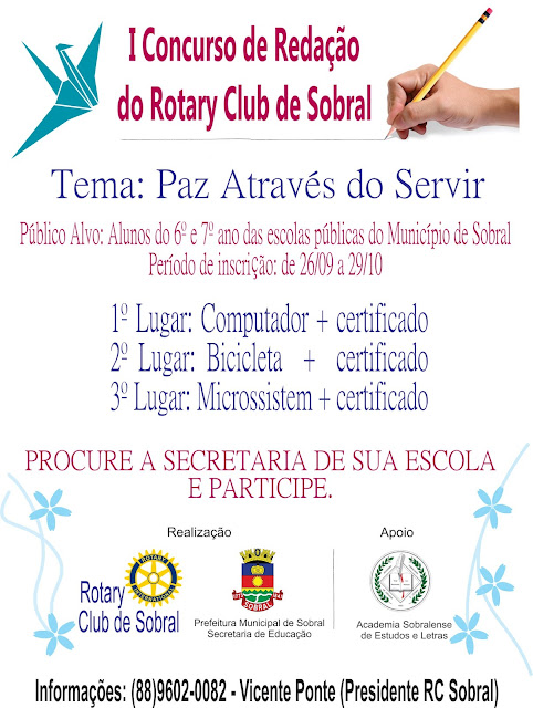 O Rotary Club de Sobral realiza o I Concurso de redação em parceria com a prefeitura de Sobral. O público destinado ao concurso são os alunos da rede municipal (6º e 7º ano). Os interessados devem se increver junto as secretarias das escolas, tendo como tema da redação: Paz através do servir.