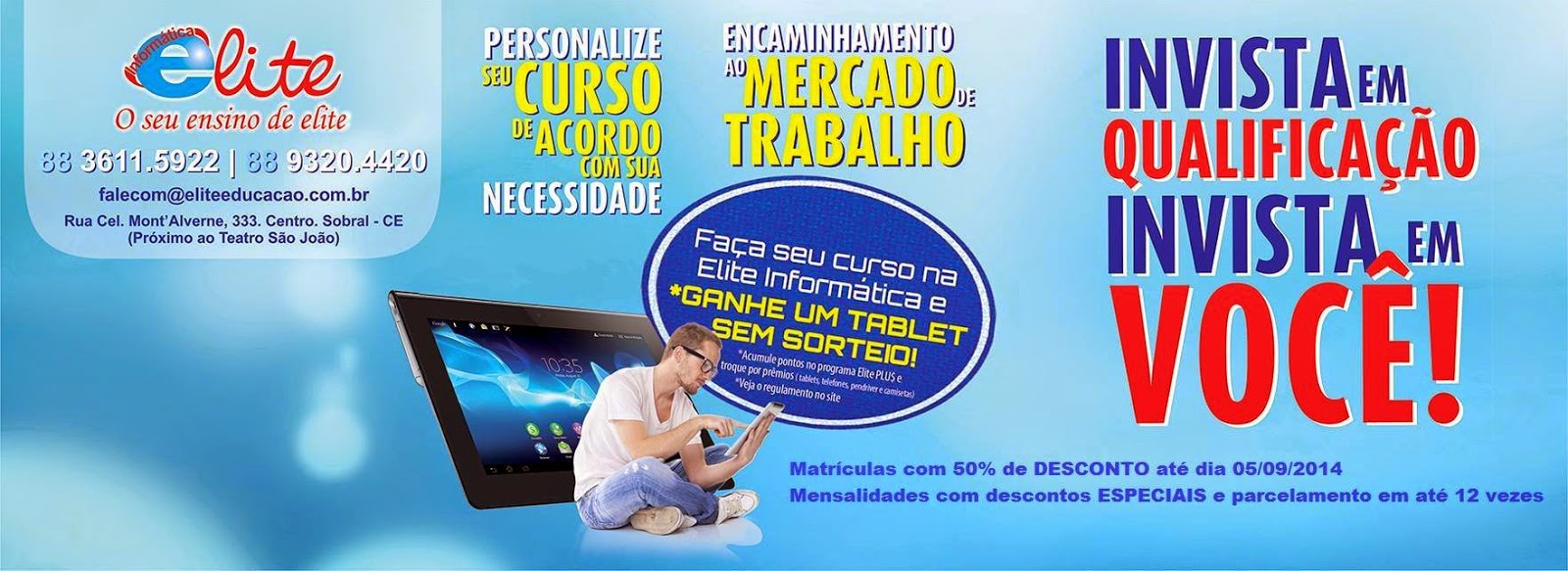 Notícias INFORME PUBLICITÁRIO | Invista em QUALIFICAÇÃO, invista em VOCÊ! On 04 set 2014 MATRÍCULAS ABERTAS! Desconto de 50% na matrícula até dia 05/09/14! Mensalidades com desconto especial e parcelamento em até 12X. Invista em QUALIFICAÇÃO, invista em VOCÊ! Ganhe TABLETS, TELEFONES, PENDRIVE e muitos outros prêmios, SEM SORTEIO! MATRÍCULAS ABERTAS! Programa de Recompensas ELITEPLU$! Onde sua mensalidade VALE PRÊMIOS! Veja regulamento no site: www.eliteeducacao.com.br Compartilhar