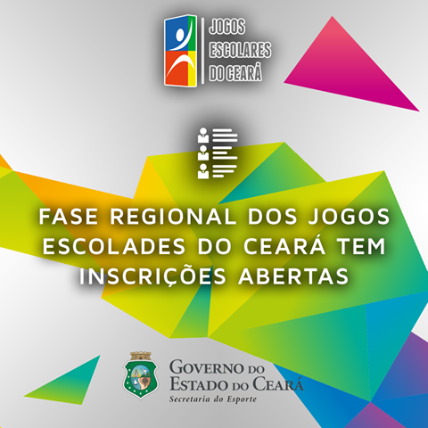 Estão abertas as inscrições para as etapas Regional do Interior e Fortaleza dos Jogos Escolares do Ceará 2016. As escolas campeãs da fase municipal deverão acessar o link abaixo para o cadastramento e inscrição de sua escola. O evento é realizado pela Secretaria do Esporte do Estado do Ceará (Sesporte), em parceria com a Secretaria da Educação (Seduc).