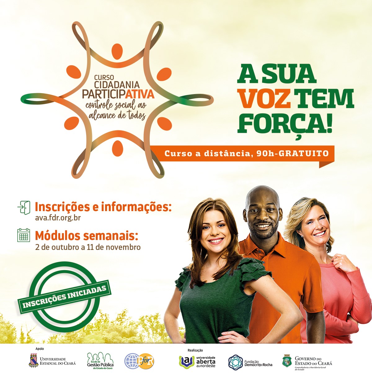 A Fundação Demócrito Rocha (FDR) em parceria com a Controladoria e Ouvidoria Geral do Estado (CGE) realizam o curso de extensão, na modalidade EAD, Cidadania ParticipATIVA: controle social ao alcance de todos. As inscrições são gratuitas e estão abertas no site da FDR (AQUI). O curso, a distância, tem início no dia 2 de outubro, com carga horária de 90 horas, e qualquer pessoa pode se inscrever.