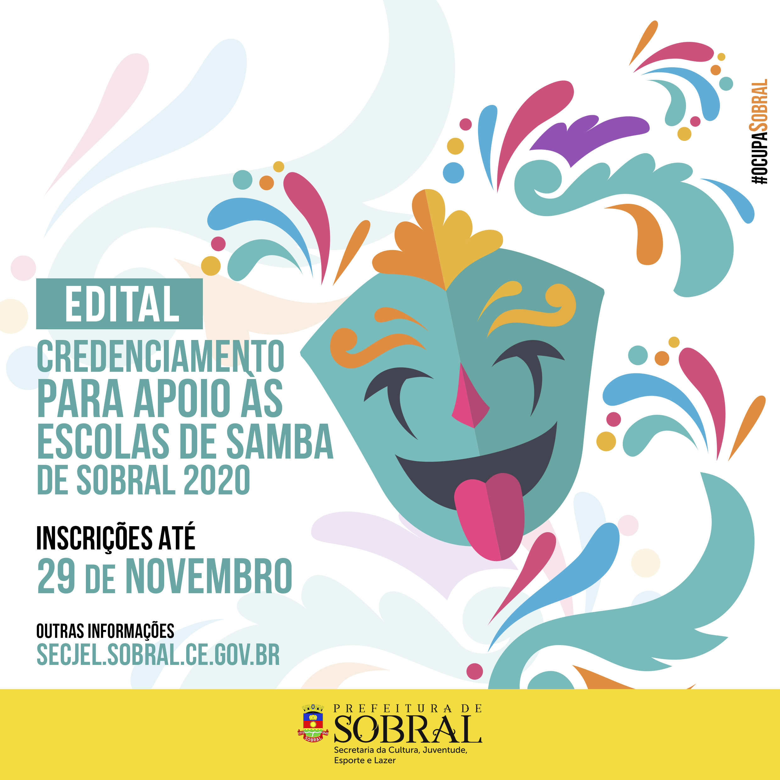 A Prefeitura de Sobral, por meio da Secretaria da Cultura, Juventude, Esporte e Lazer (Secjel), lançou o Edital de Credenciamento para Apoio às Escolas de Samba de Sobral, com o intuito de apoiar financeiramente e selecionar cinco projetos voltados para a montagem e apresentação de escolas de samba do município, durante o mês de fevereiro de 2020. As inscrições encerram dia 29 de novembro.