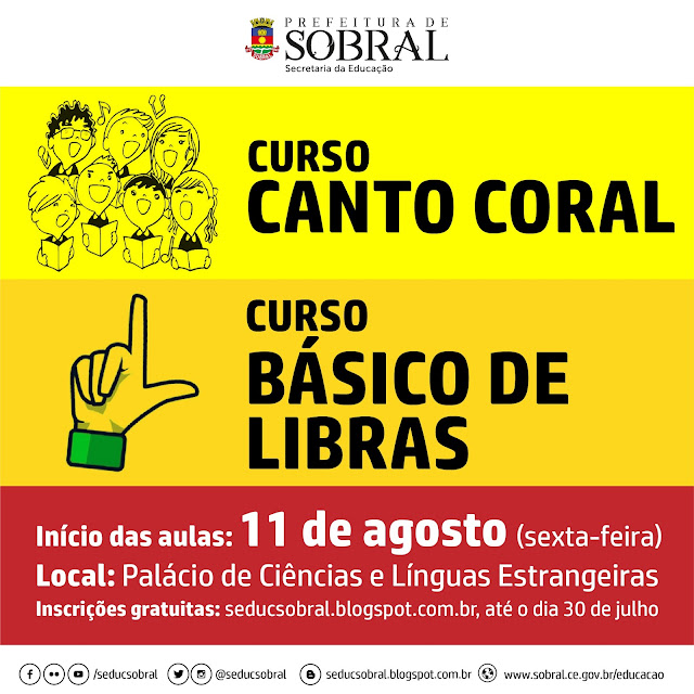 Terminam, no dia 30 de julho, as inscrições para os cursos de Língua Brasileira de Sinais (Libras) e Canto Coral, no Palácio de Ciências e Línguas Estrangeiras de Sobral. Os cursos são gratuitos e abertos para todos os interessados. As inscrições serão realizadas, exclusivamente, pelo formulário eletrônico em goo.gl/AcUNsk
