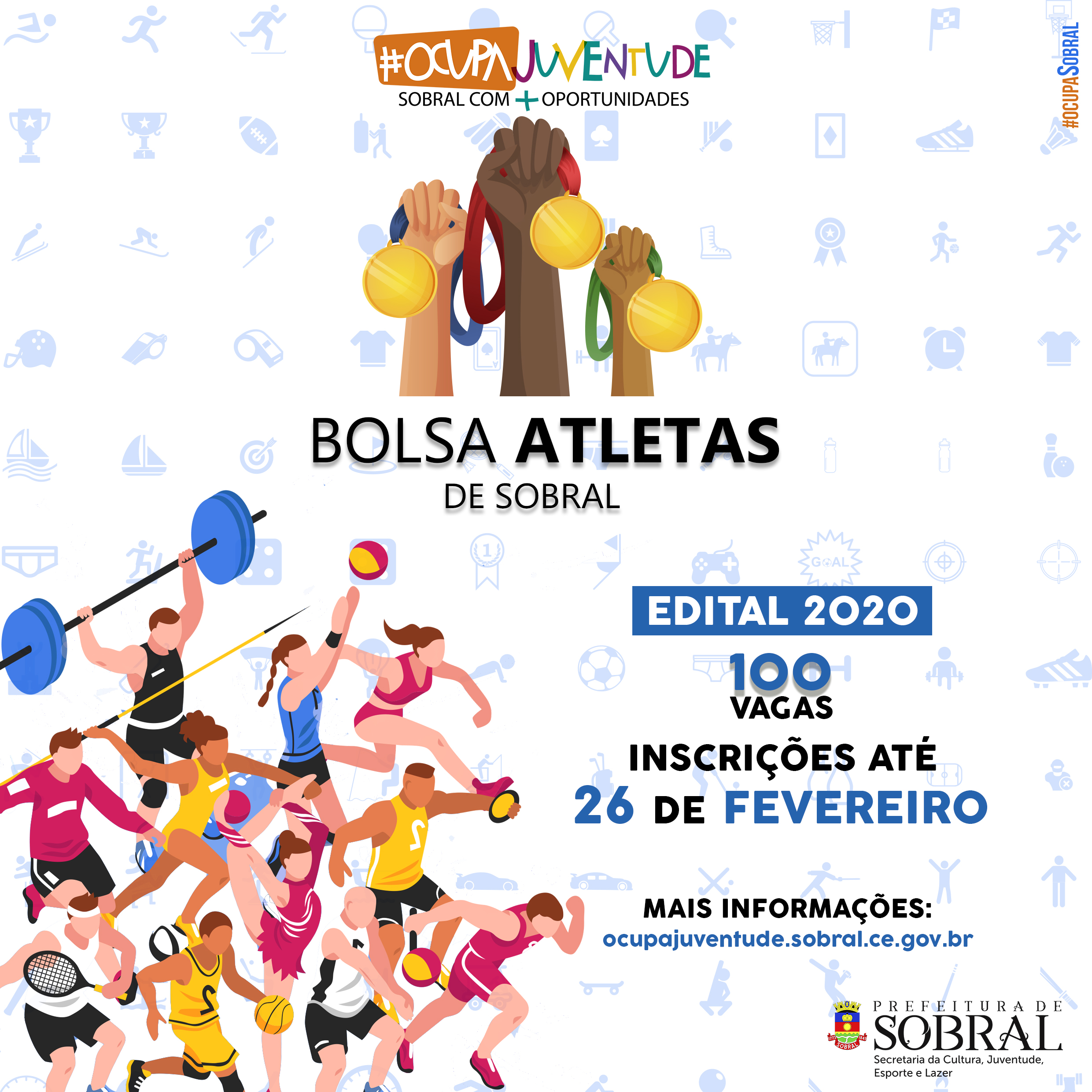 A Prefeitura de Sobral, por meio da Secretaria da Cultura, Juventude, Esporte e Lazer (Secjel), abriu novas inscrições para o projeto Bolsa Atletas, integrante do programa #ocupaJuventude. São ofertadas 100 vagas e os selecionados receberão uma bolsa-auxílio: 50 bolsas nível I, no valor de R$ 200,00; e mais 50 bolsas nível II, no valor de até R$ 400,00. As inscrições seguem abertas até o dia 26 de fevereiro.