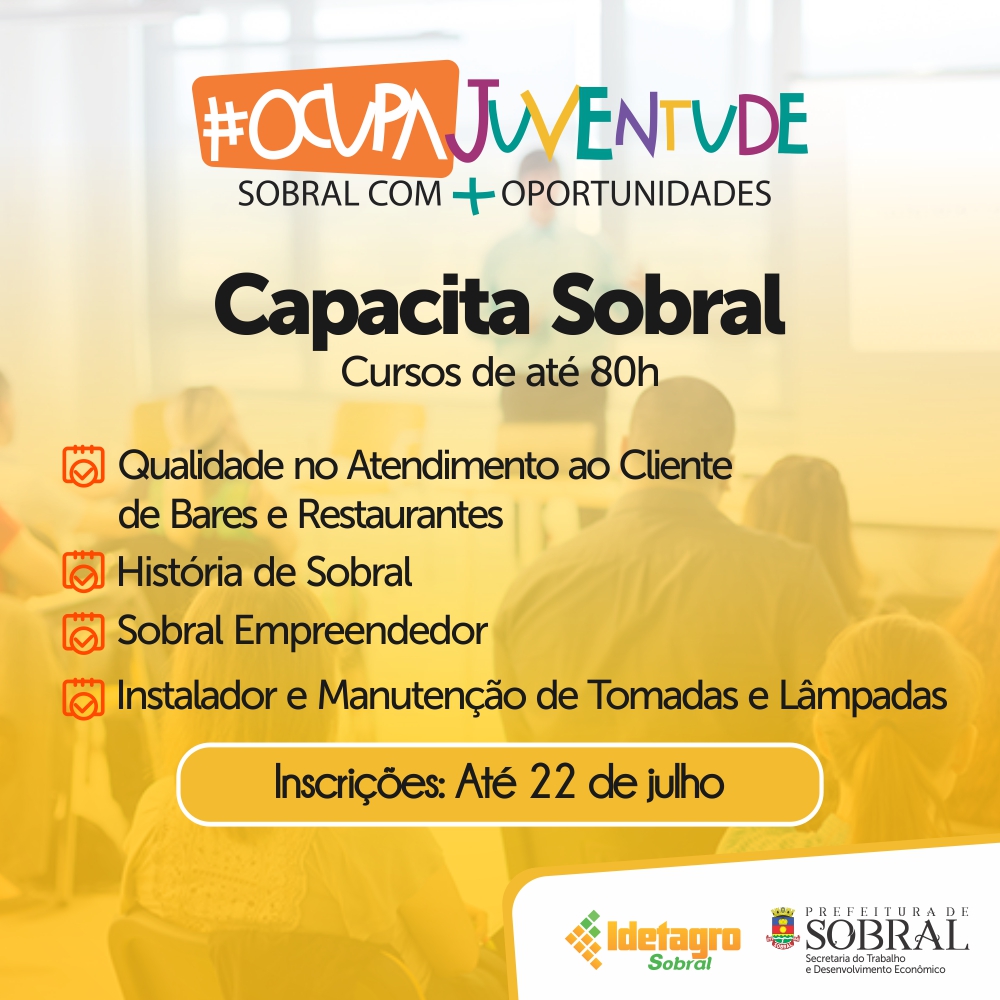 A Prefeitura de Sobral, por meio da Secretaria do Trabalho e Desenvolvimento Econômico (STDE), está com inscrições abertas para os cursos do projeto Capacita Sobral, que integra o programa #ocupaJuventude. Serão ofertados os cursos de “Qualidade no atendimento ao cliente de bares e restaurantes”, “História de Sobral”, “Sobral Empreendedor” e “Instalador e manutenção de tomadas e lâmpadas”. As inscrições acontecem até o dia 22 de julho.