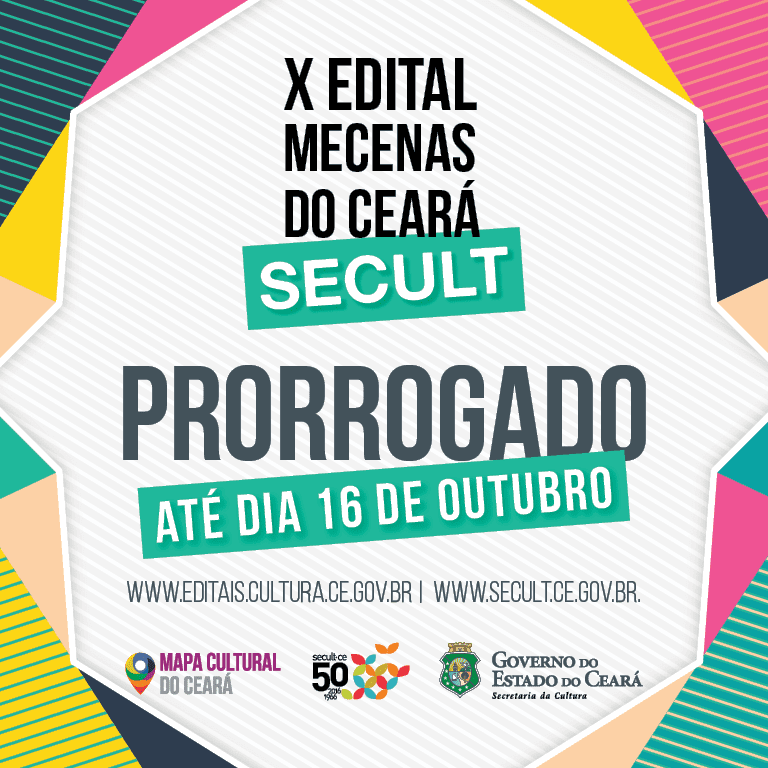 A Secretaria da Cultura do Estado do Ceará (Secult) informa que as inscrições para o X Edital Mecenas do Ceará foram prorrogadas até o dia 16 de outubro. O edital e os formulários podem ser acessados no site (AQUI) e também no site da Secult – clique (AQUI) para acessar o 1º Termo Aditivo ao Edital.