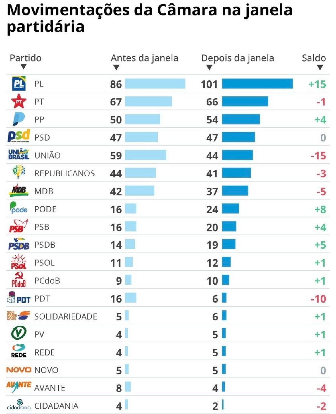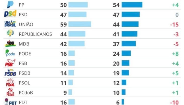 O grande destaque ficou por conta do Partido Liberal (PL), que viu sua presença crescer de 86 para 101 deputados, consolidando-se como a maior força no cenário político atual. O Podemos e o PSDB também tiveram avanços, com o primeiro passando de 16 para 24 parlamentares e o segundo de 14 para 19 cadeiras.