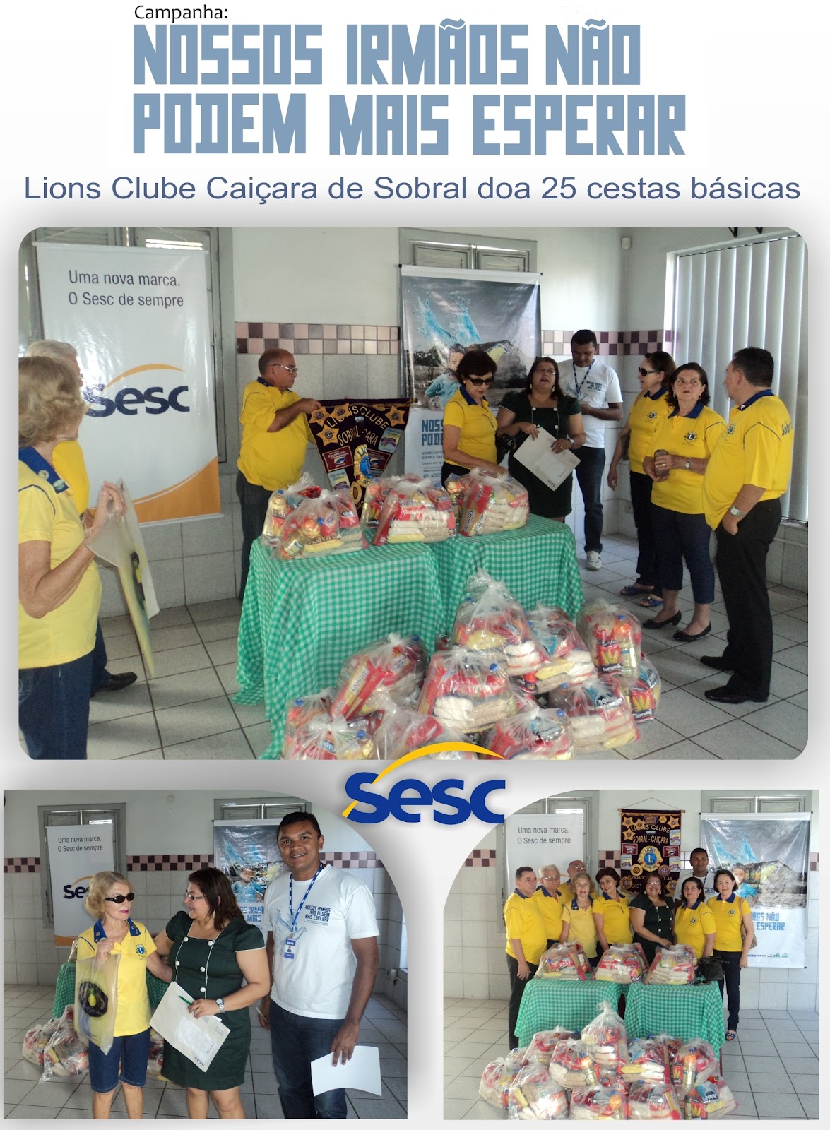 O Lions Clube Caiçara de Sobral doou nesta segunda(1), 25 cestas básicas para as vítimas da seca no Ceará, através da capanha: Nossos Irmãos não podem esperar, idealizada pelo sistema Fecomércio (SESC/SENAC) com o apoio do sistema Verdes Mares e Sindiônibus.