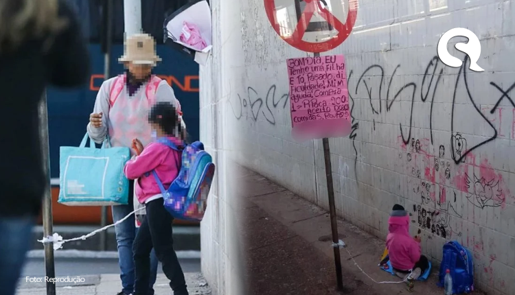 Mãe amarra filha em placa para vender pipoca em semáforo