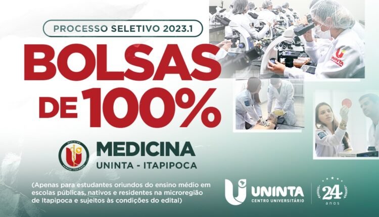 O Centro Universitário Inta (UNINTA) torna público o edital de seleção para o preenchimento de 05 (cinco) vagas com bolsas integrais para o curso de Medicina Campus Itapipoca. As inscrições estão abertas e devem durar até o dia 14 de fevereiro de 2023 pelo link uninta.vc/bolsasitapipoca