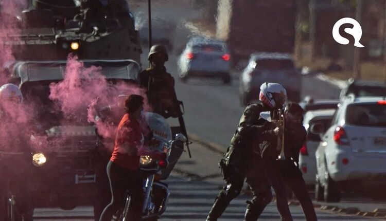 Um grupo de manifestantes, vestindo blusas com a sigla do Partido dos Trabalhadores (PT), jogou bombas de fumaça vermelha em militares que desfilavam junto a veículos blindados, armamentos e outros equipamentos da Força de Fuzileiros da Esquadra. Cerca de 40 blindados, caminhões e tanques passaram em frente ao Palácio do Planalto na manhã desta terça-feira (10/8).