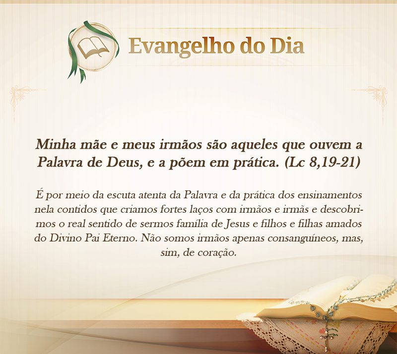 Notícias Minha mãe e meus irmãos são aqueles que ouvem a Palavra de Deus, e a põem em prática. (Lc 8,19-21) On 22 set 2015 Compartilhar