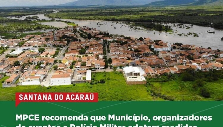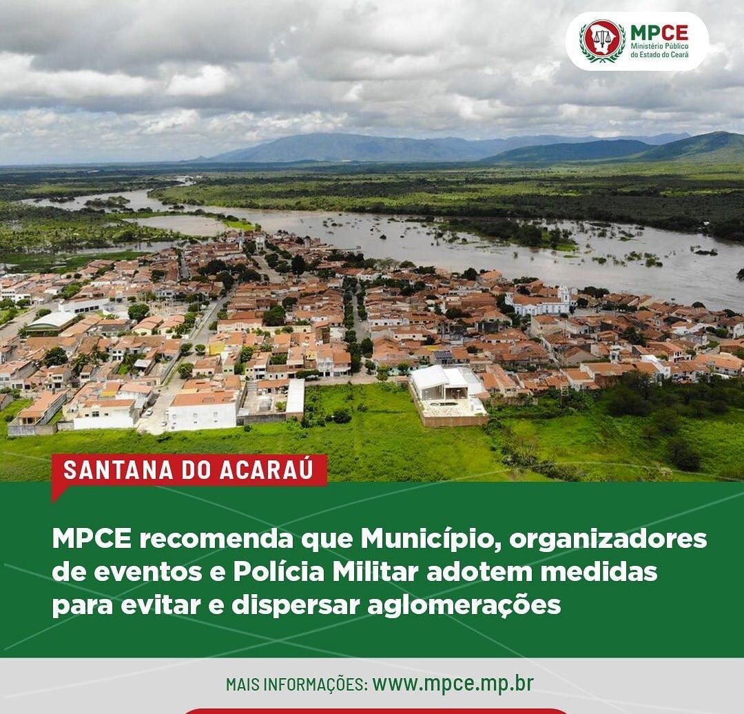 O Ministério Público do Estado do Ceará, através da Promotoria de Justiça de Santana do Acaraú, expediu recomendação, nesta segunda-feira (23), para que a prefeitura de Santana do Acaraú, a Secretaria Municipal de Saúde, a Vigilância Sanitária e organizadores de eventos realizados no município adotem providências necessárias para garantir o efetivo cumprimento dos decretos estaduais e protocolos sanitários de enfrentamento à Covid-19, inclusive em festas, vaquejadas e eventos esportivos. O procedimento administrativo recomenda ainda que a Polícia Militar faça o necessário para dispersar aglomerações.