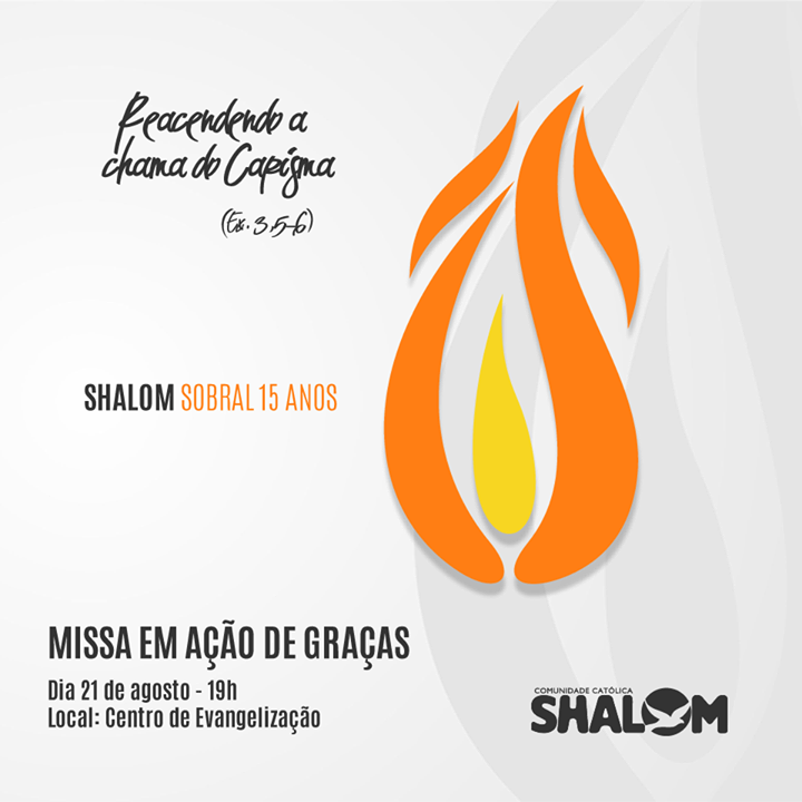 Notícias Missa em Ação de graças pelos 15 anos do Shalom em Sobral On 20 ago 2014 Missa em Ação de graças pelos os 15 anos do Shalom em Sobral. Participe!Local: Centro de Evangelização ShalomRua Cel. Monte Alverne, 1498 – Campo dos Velhos – Sobral-CE Compartilhar