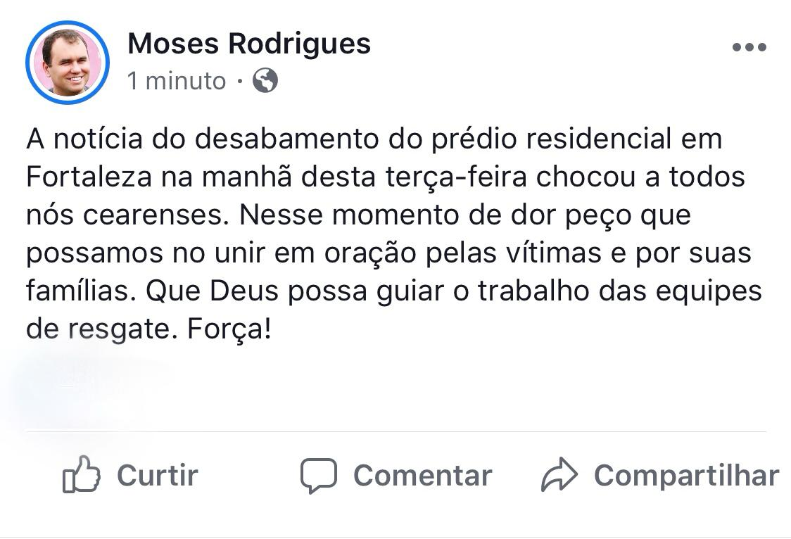 “A notícia do desabamento do prédio residencial em Fortaleza na manhã desta terça-feira chocou a todos nós cearenses. Nesse momento de dor peço que possamos no unir em oração pelas vítimas e por suas famílias. Que Deus possa guiar o trabalho das equipes de resgate. Força!”