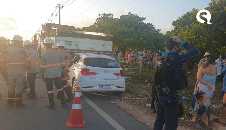 Um grave acidente deixou três funcionários que prestam serviço à ENEL mortos e um ficou gravemente ferido na tarde desta quinta-feira (9) na CE 085, na saída da cidade de Itarema no litoral oeste do Ceará. Segundo a PM, o condutor de um HB20 branco, não obedeceu a sinalização na pista e invadiu o local onde os funcionários da empresa estavam fazendo manutenção da rede de energia. O veículo colidiu na traseira do caminhão que estava parado e atropelou quatro funcionários, três deles morreram no local e a quarta vítima foi socorrida em estado grave ao Hospital Municipal Natércia Rios de Itarema.