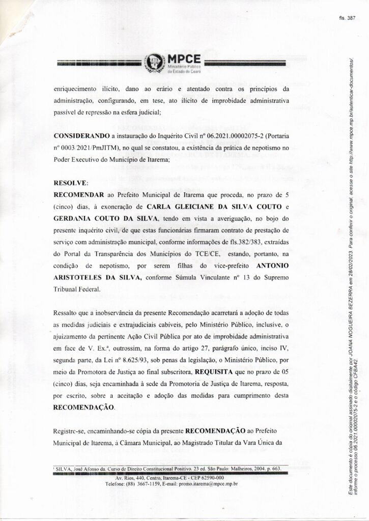 Por fim, a Promotora diz que a instauração do Inquérito Civil nº 06.2021.00002075-2 (Portaria nº 0003/2021/PmJITM), constatou, a existência da prática de nepotismo no Poder Executivo do Município de Itarema; e recomenda ao Prefeito Municipal de Itarema que proceda, no prazo de 5 (cinco) dias, à exoneração das filhas do vice-prefeito, a advogada Carla Gleiciane da Silva Couto e a fisioterapeuta Gerdania Couto da Silva, “tendo em vista a averiguação, no bojo do presente inquérito civil, de que estas funcionárias firmaram contrato de prestação de serviços com a administração municipal, conforme informações de fls382/383, extraídas do Portal da Transparência dos municípios do TCE/CE, estando portanto, na condição de nepotismo, por serem filhas do vice-prefeito Antônio Aristóteles da Silva”, diz trecho da recomendação.