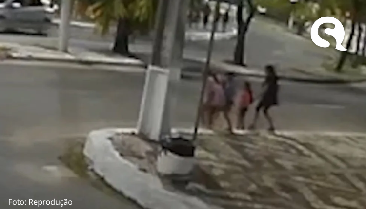 Nas imagens, é possível ver que a mulher aguardava a passagem de um motociclista antes de atravessar, enquanto uma criança que estava com ela também se preparava para a travessia