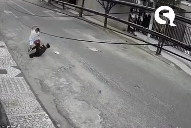 Nas imagens é possível ver a vítima chegando na calçada do salão quando o suspeito aparece e faz a abordagem. Ela ainda tenta correr, mas é seguida pelo suspeito que a agarra e ambos caem na pista.
