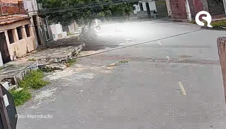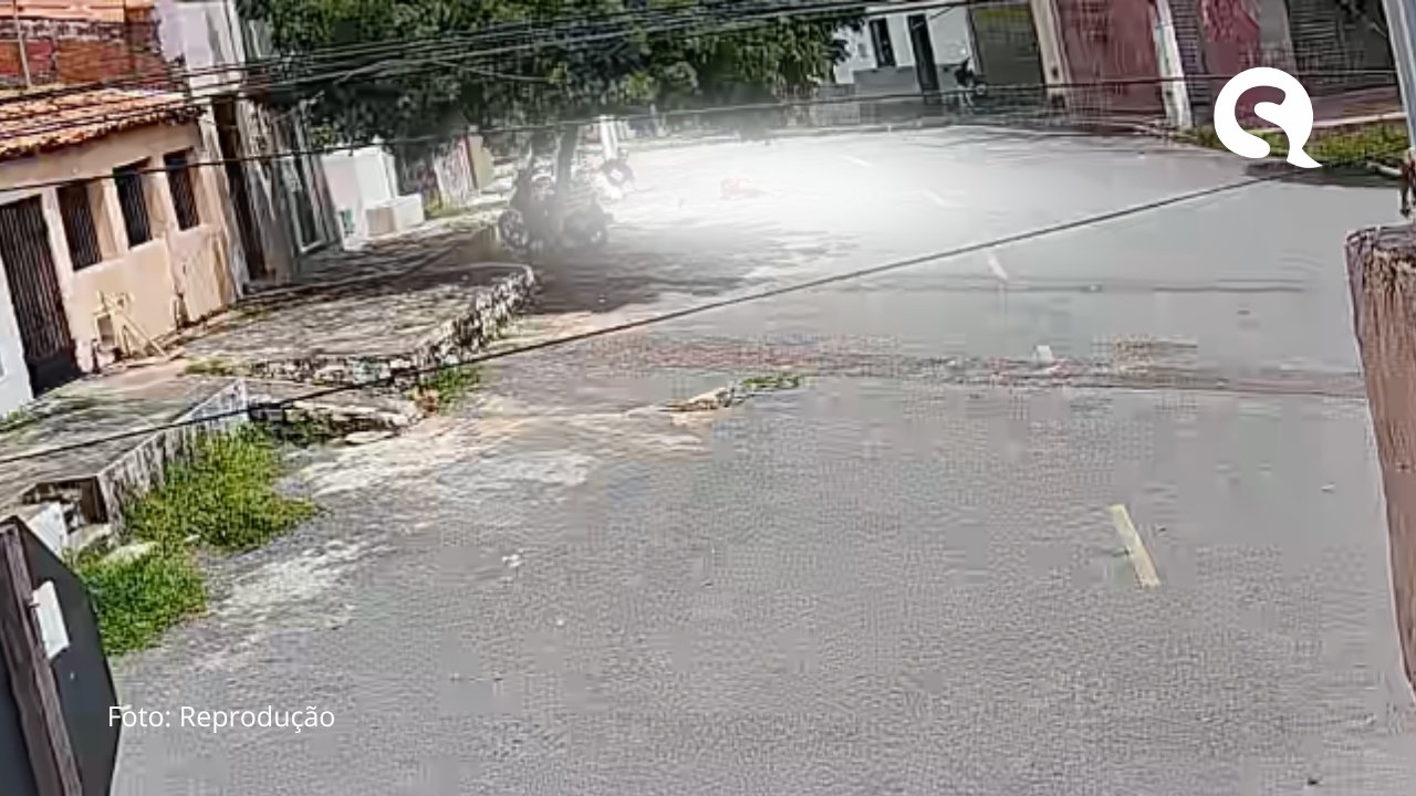 Nas imagens, é possível ver o motociclista trafegando em alta velocidade e sem capacete, quando atinge a vítima.