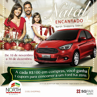 O North Shopping Sobral lançou a Campanha “Natal Encantado”. A cada R$ 100,00 (cem reais) em compras realizadas nas lojas do shopping, entre os dias 10 de novembro e 30 de dezembro, os consumidores poderão apresentar a nota fiscal e receber um cupom para concorrer a um novo Ford Ka 0km. A urna se encontra próxima a Esplanada. O sorteio será realizado dia 30 de dezembro, às 19h, na Praça de Alimentação, e o resultado da apuração divulgado nas dependências do Shopping, nas redes sociais e pelo site www.northshoppingsobral.com.br.