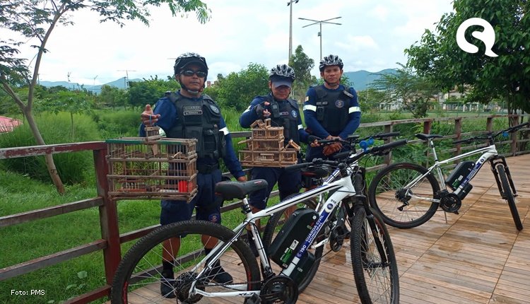 Durante patrulhamento no Parque Pajeú, nesta terça-feira (07/02), uma equipe do Grupamento de Ciclopatrulhamento da Guarda Civil Municipal de Sobral (GCMS) flagrou duas aves silvestres, em gaiolas, no meio da vegetação.