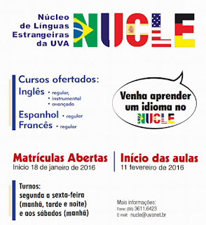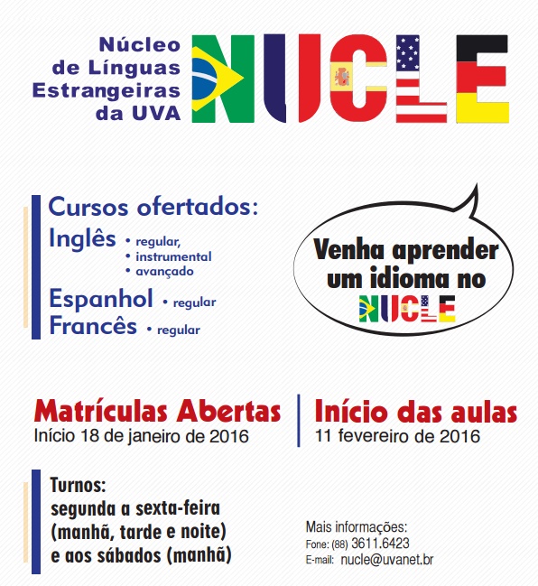 O Núcleo de Línguas Estrangeiras da UVA (NUCLE) está com matrículas abertas para alunos novatos e veteranos para o Semestre 2016.1 nos cursos de Inglês (regular, instrumental e avançado),Espanhol (regular e avançado) e lista de turma para Italiano e Francês. As matrículas são no próprio NUCLE, que funciona no primeiro andar do bloco do Curso de Pedagogia (antigo NDC), no campus da Betânia. O horário de atendimento é das 8h às 12h e das 14h às 21h.