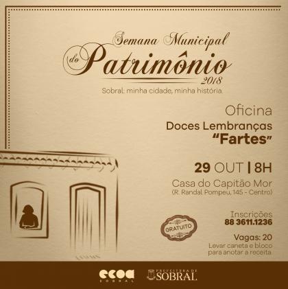 Como parte da programação da Semana Municipal do Patrimônio de Sobral, será ofertada, nesta segunda-feira (29/10), a partir das 8 horas, na Casa do Capitão-Mor, a Oficina Doces Lembranças, que tem como objetivo a disseminação da forma de produzir os Fartes, um pequeno doce de massa fina e origem portuguesa, que conta um pouquinho da história do Brasil. Era feito de forma artesanal e servido, juntos aos bulins, queijadinhas, sequilhos e bolos, os doces da época.