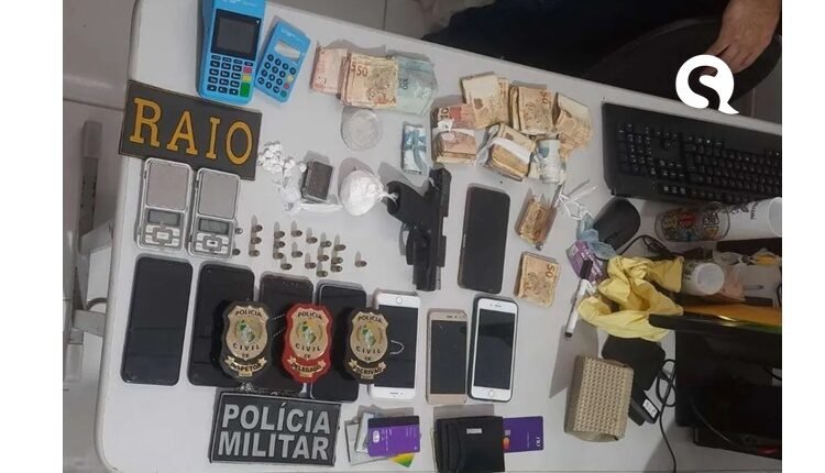 Após buscas na residência, os policiais apreenderam uma pistola, 20 munições, uma balança de precisão, máquinas de cartão de crédito, aparelhos celulares, 67 gramas de cocaína, 13 pedras de crack, uma quantidade de maconha e uma quantia em dinheiro.