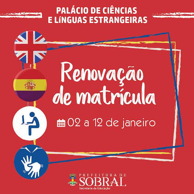 O prazo para renovação de matrícula dos cursos de Inglês e Libras, exclusivos para gestores, professores e servidores da rede pública de ensino de Sobral, também acontece no período de 2 a 12 de janeiro 2018, exclusivamente pela internet. As aulas são ministradas às sextas e aos sábados e terão início nos dias 23 e 24 de fevereiro.