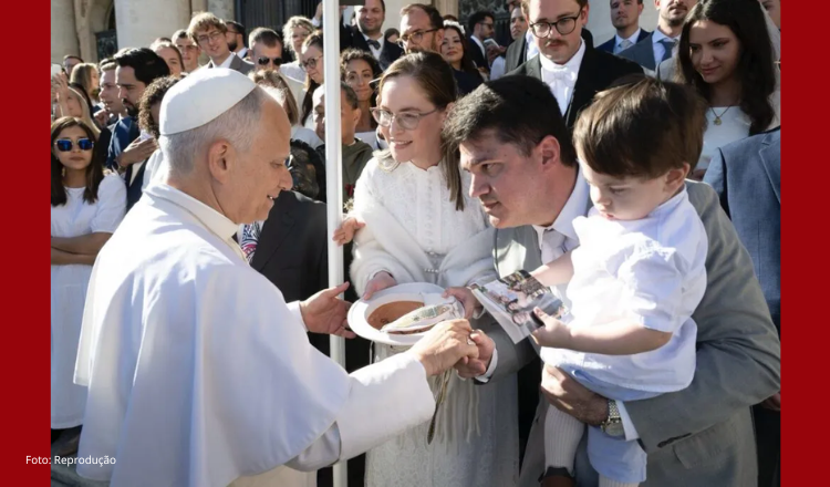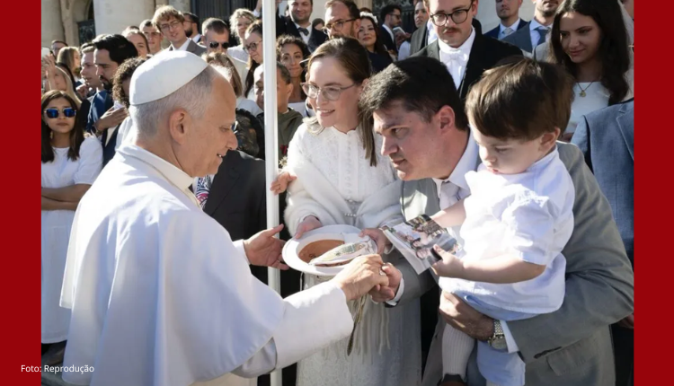 O casal cearense Melchior e Camila Quental foi abençoado pelo Papa Leão XIV, durante passagem da família por Roma. Os dois buscaram pedir a bênção do Santo Padre para o filho Joaquim, então com 1 ano e 4 meses.