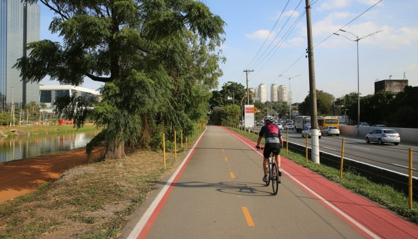 Créditos da imagem: imagem colorida mostra ciclovia no parque estadual bruno covas, ao lado da marginal pinheiros
