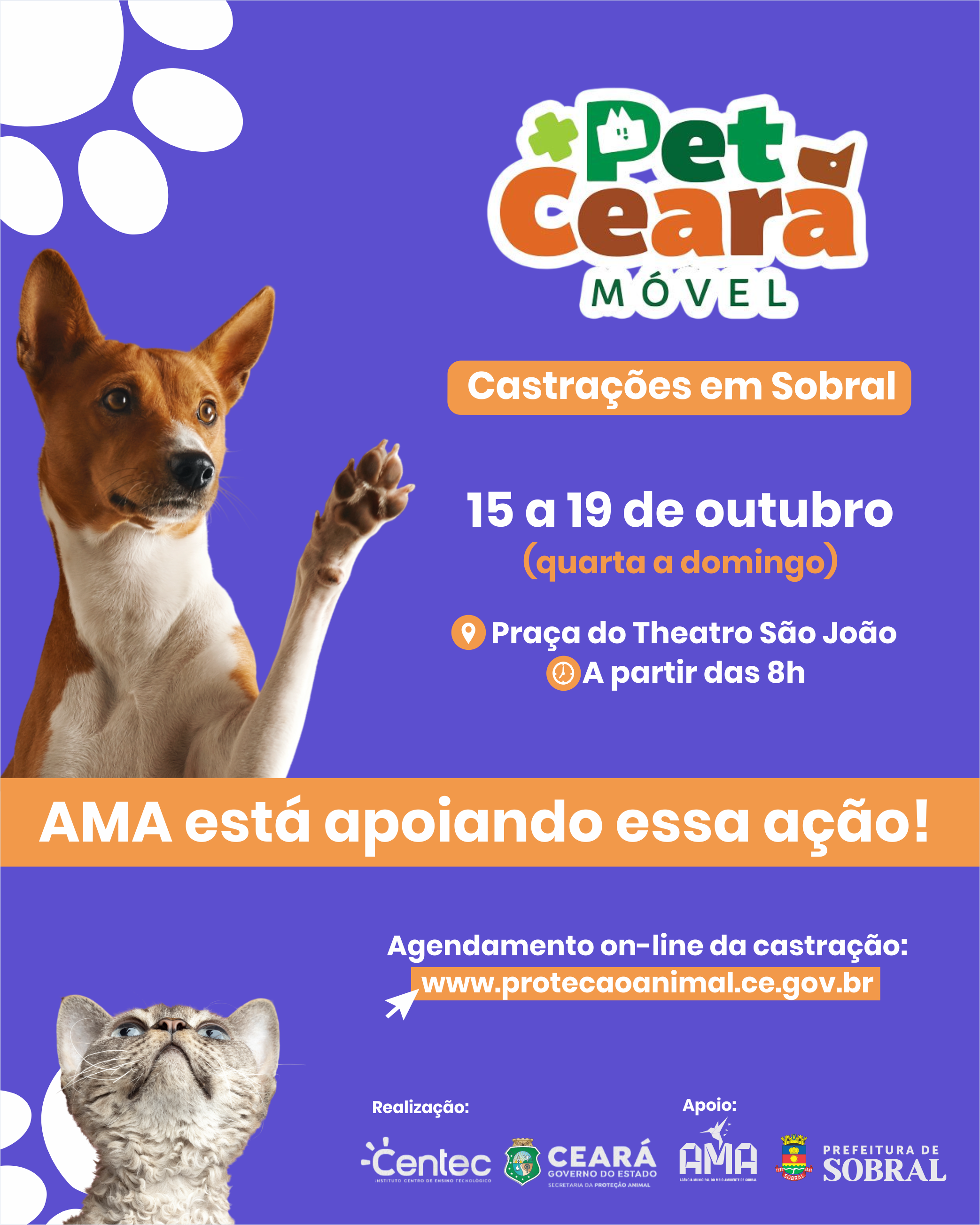 A Prefeitura de Sobral, por meio da Agência Municipal do Meio Ambiente (AMA), está apoiando o projeto Pet Ceará Móvel, uma iniciativa do Governo do Estado, realizada pela Secretaria da Proteção Animal (SPA). De 15 a 19 de outubro, a ação acontecerá na Praça do Theatro São João, a partir das 8h, com castração gratuita para cães e gatos.