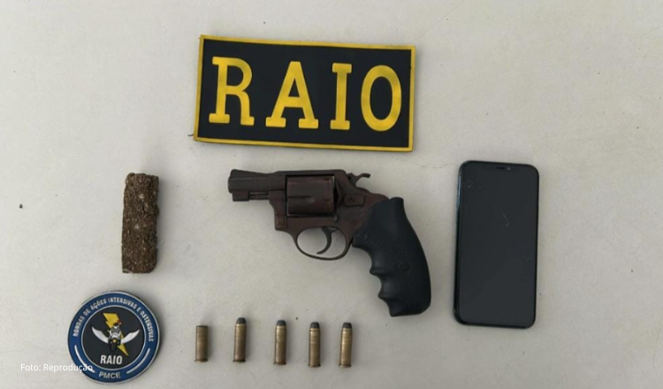 Com o suspeito, foram apreendidos um revólver calibre .38, com cinco munições, sendo quatro picotadas e uma deflagrada, uma balança de precisão, um aparelho celular e aproximadamente 25 gramas de maconha.