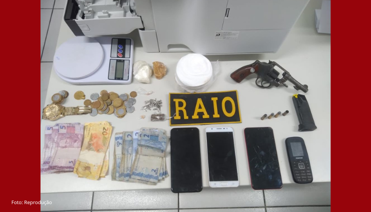 um revólver calibre 32, munições, 496 g de cocaína, 39 g de crack, 3 g de maconha, quatro celulares, um relógio, um cordão, embalagens para droga, uma balança e R$ 149,25 em espécie.