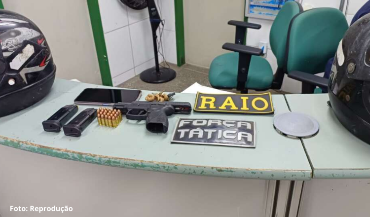 As equipes receberam informações da Subagência de Inteligência (SAI) que apontavam a presença de dois suspeitos no Centro do município. Ao serem abordados, ambos estavam com capacetes nas mãos e um deles apresentava um volume na cintura. Durante a busca pessoal, foi encontrada uma pistola calibre 9 mm, dois carregadores e 22 munições.