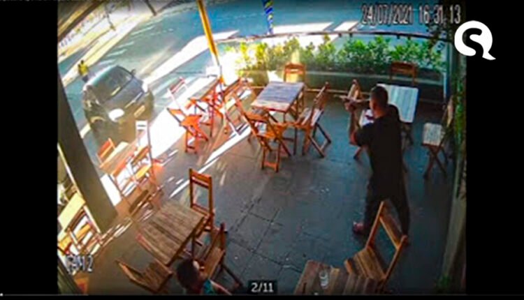 Oito minutos depois, às 16h31, o homem que havia saído do local volta em seu veículo. O outro, que continua na loja, já o recebe apontando uma arma. Ambos debatem, mas não há disparos do armamento.