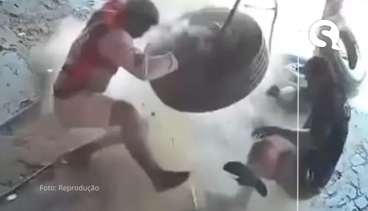 Uma câmera de segurança instalada em uma borracharia do município de Reriutaba, no interior do Ceará, flagrou o momento em que um pneu estoura e atinge dois mecânicos que trabalhavam no local. Eles não ficaram gravemente feridos.